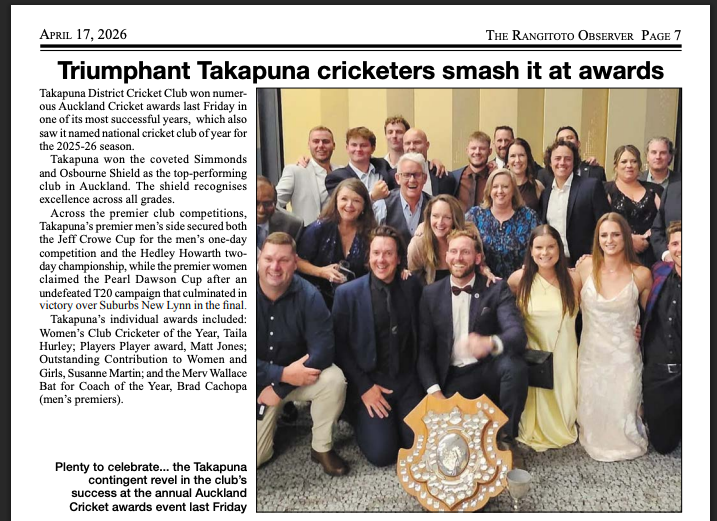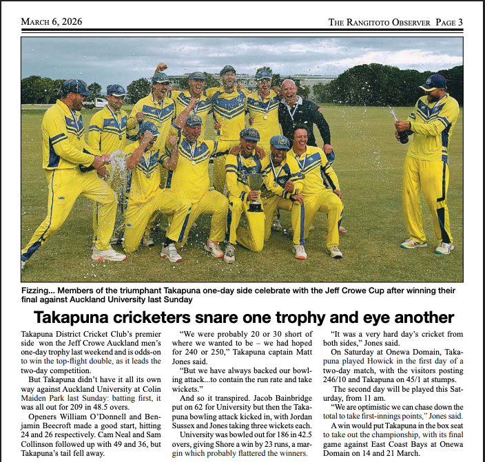 Having applied for and been granted affiliation to the Auckland Cricket Association, the Club entered teams in the First Intermediate and First Junior Grades of the Association's 1950/51 competitions and according to its Annual Report for that season, the Takapuna Club teams were place fourth and third in their respective grades. During that season, results for both teams were regularly published in the "North Shore Times" and photocopies of reports on most matches played between November 1950 and March 1951 are reproduced on the following two pages.